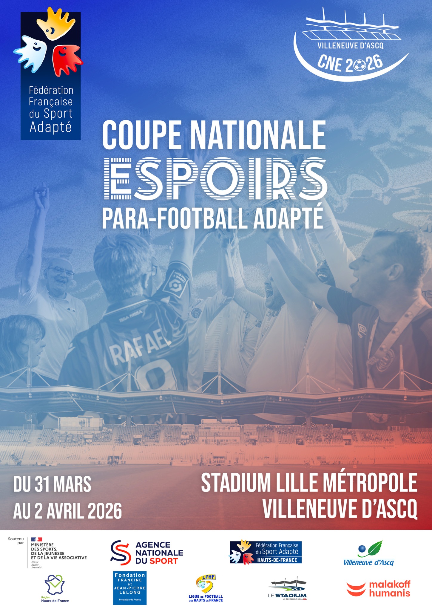 La Ligue Sport Adapté des Hauts-de-France se prépare à accueillir un événement national majeur : la Coupe Nationale Espoirs de Para Football Adapté 2026, qui se déroulera du 31 mars au 2 avril 2026 au Stadium Lille Métropole à Villeneuve-d’Ascq.