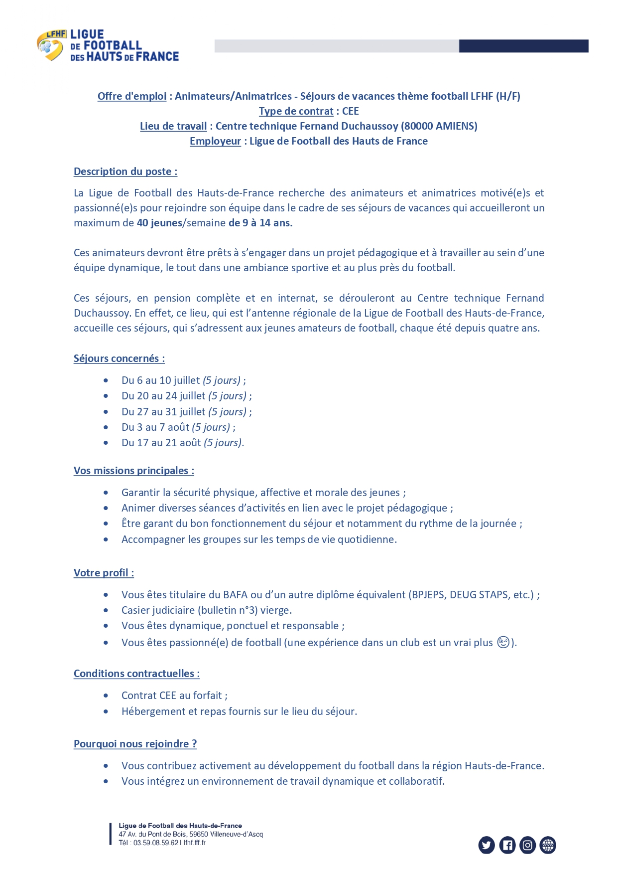 La Ligue de Football des Hauts-de-France est à la recherche d’animateurs/animatrices pour ses séjours de vacances (LFHF Académie).
