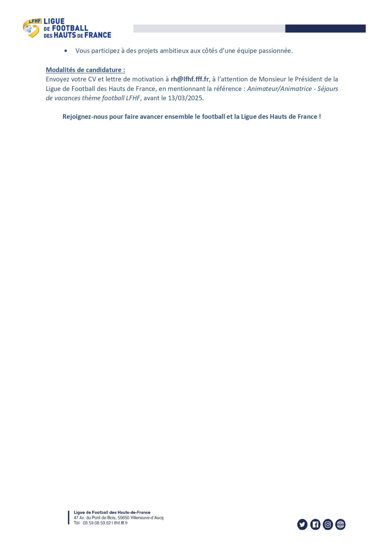 ⚠️ Les candidatures sont à envoyer avant le 𝟏𝟑 𝐦𝐚𝐫𝐬 𝟐𝟎𝟐𝟔 par mail à l’attention du Président de la Ligue en mentionnant la référence « Animateur/Animatrice – Séjours de vacances thème football LFHF » à l’adresse suivante : rh@lfhf.fff.fr